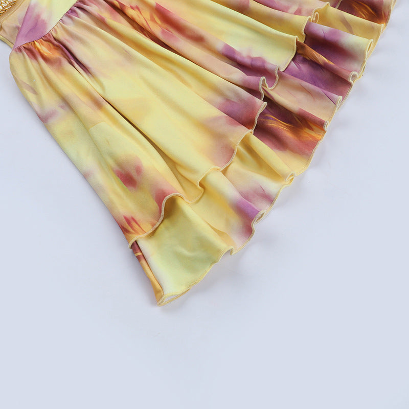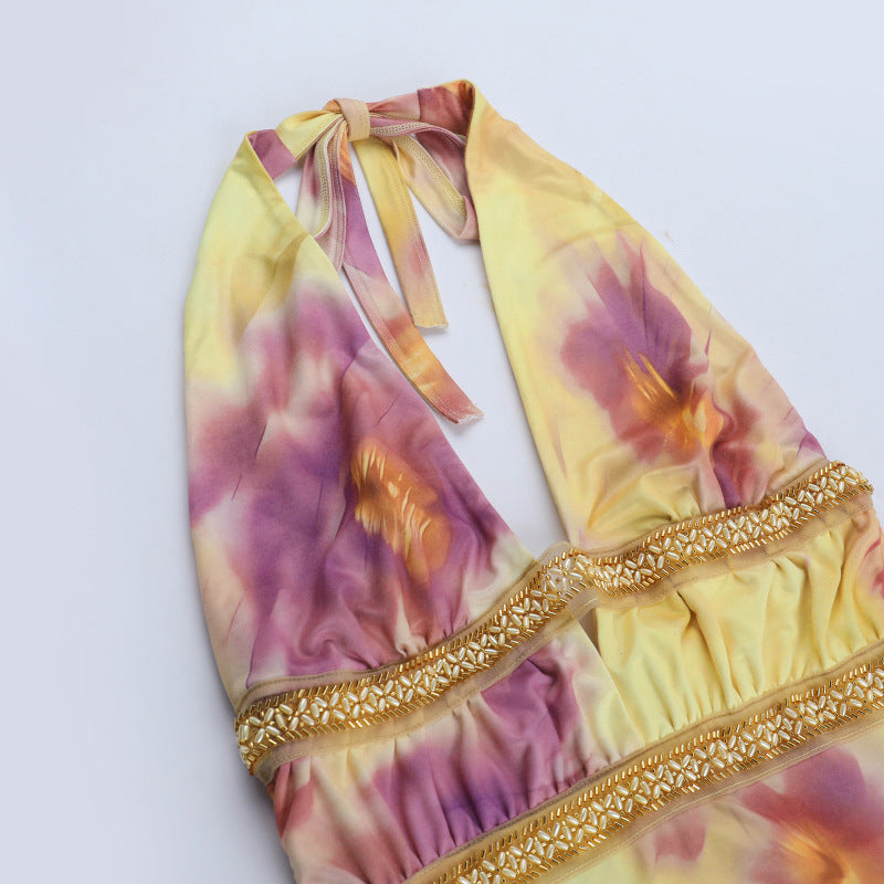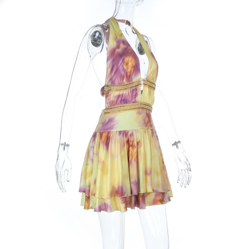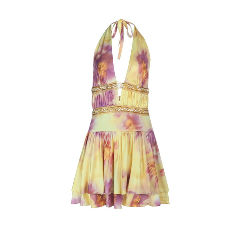 Halter self tie print deep v neck mini dress | Festival Outfits Women