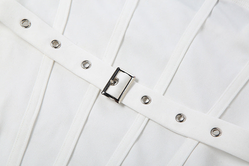 Hollow out self tie ruched buckle mini dress