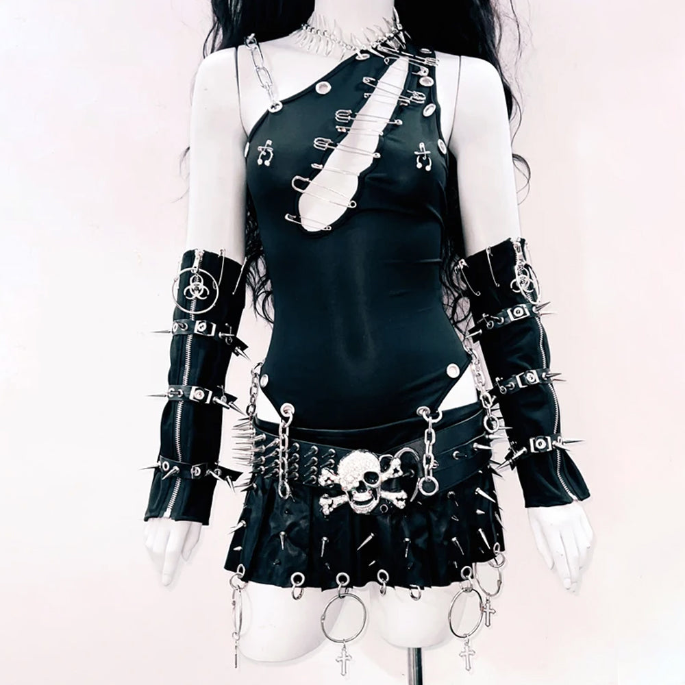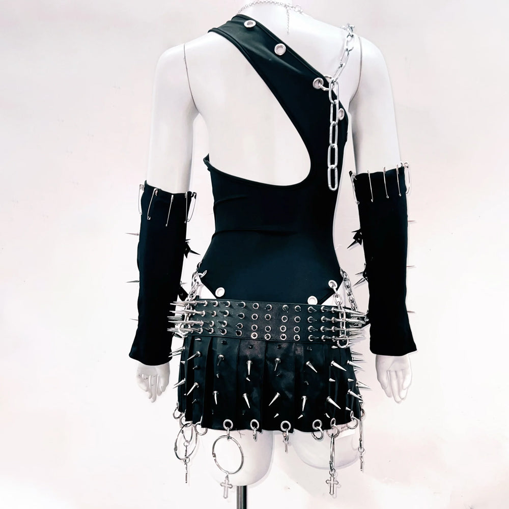 Irregular hollow out metal chain backless bodysuit