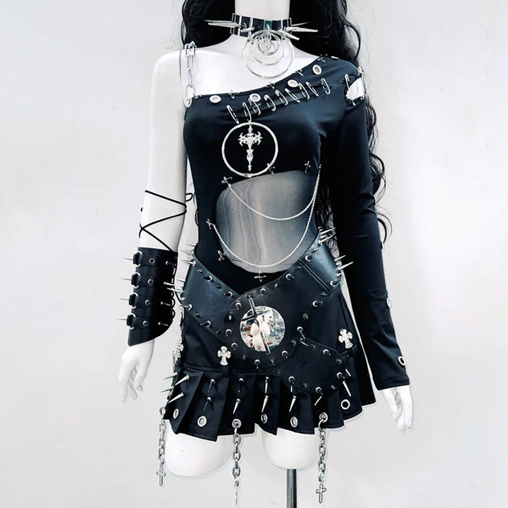 Irregular o ring metal chain long sleeve hollow out bodysuit