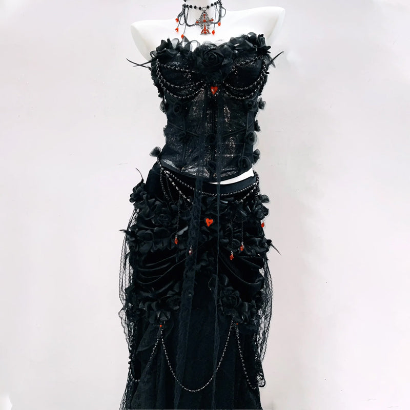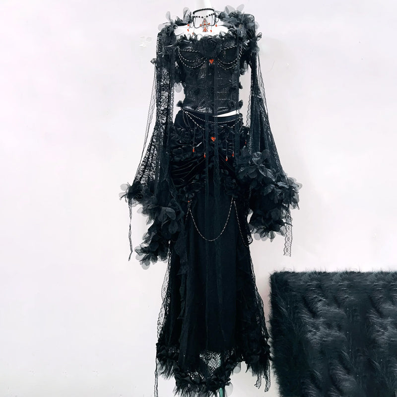 Long flared sleeve beaded flower applique lace maxi skirt set | Festival Outfits Women