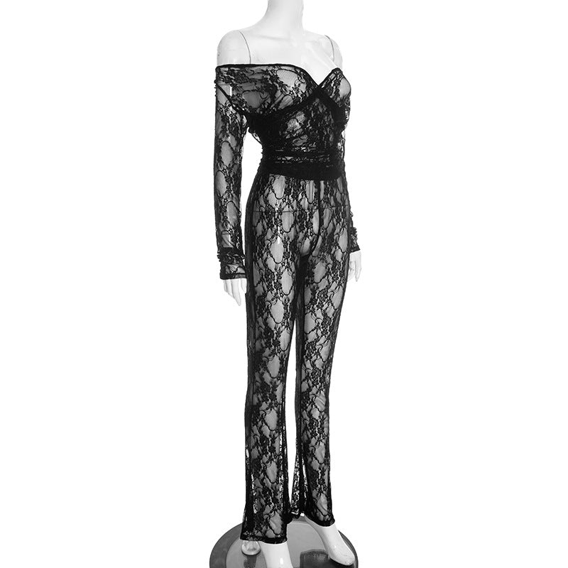 Off shoulder long sleeve lace see through pant set
