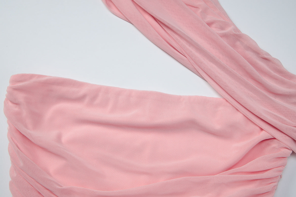 Ruched one shoulder irregular mesh solid top