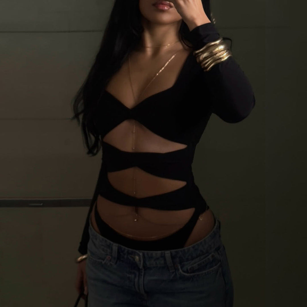 Long sleeve hollow out v neck solid bodysuit | Festival Outfits Women