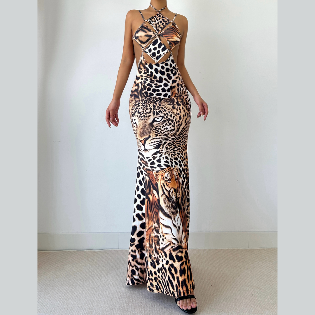 Tiger stripes print halter self tie hollow out cut out maxi dress | Festival Outfits Women