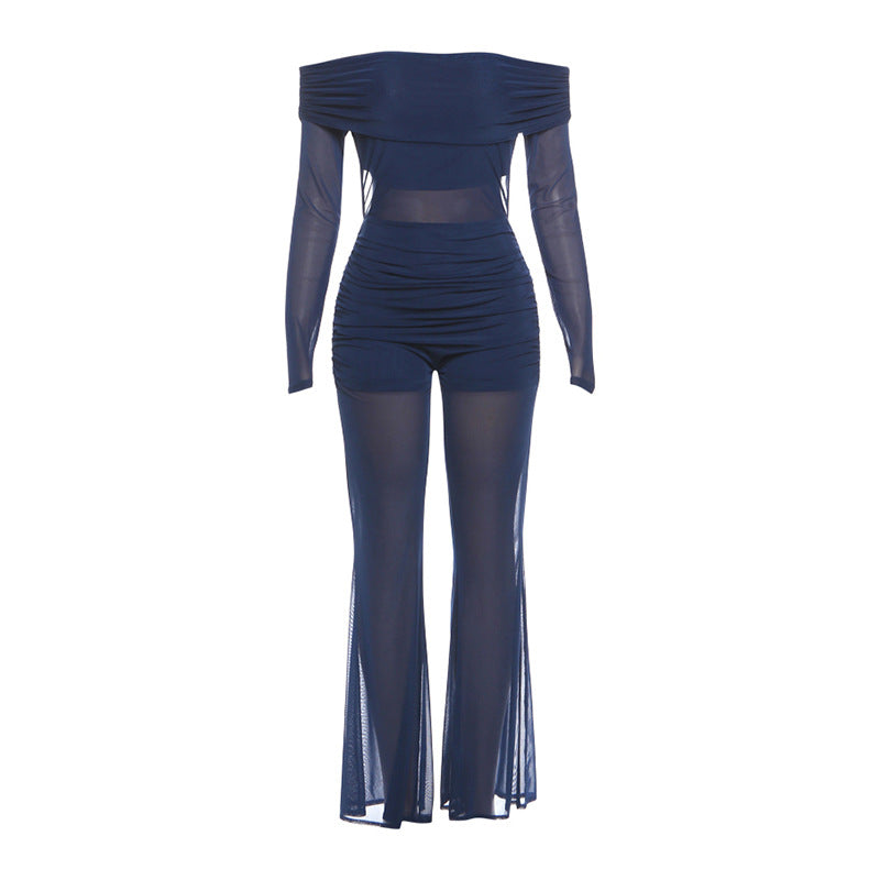 Off shoulder long sleeve ruched mesh jumpsuit | Festival Outfits Women