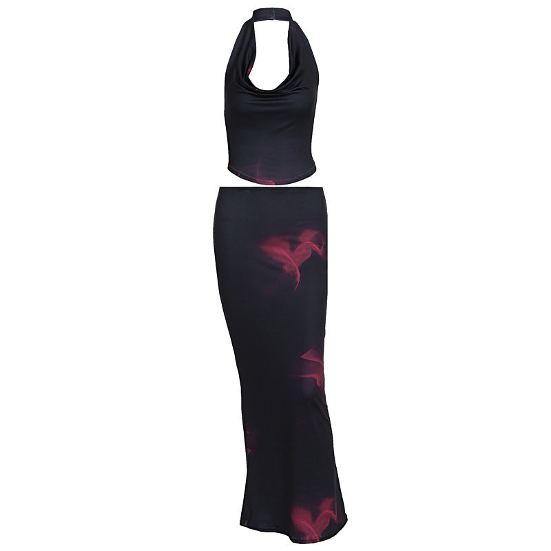 Halter cowl neck self tie print maxi skirt set