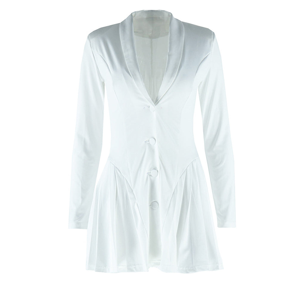 Long sleeve v neck pleated button padded mini dress