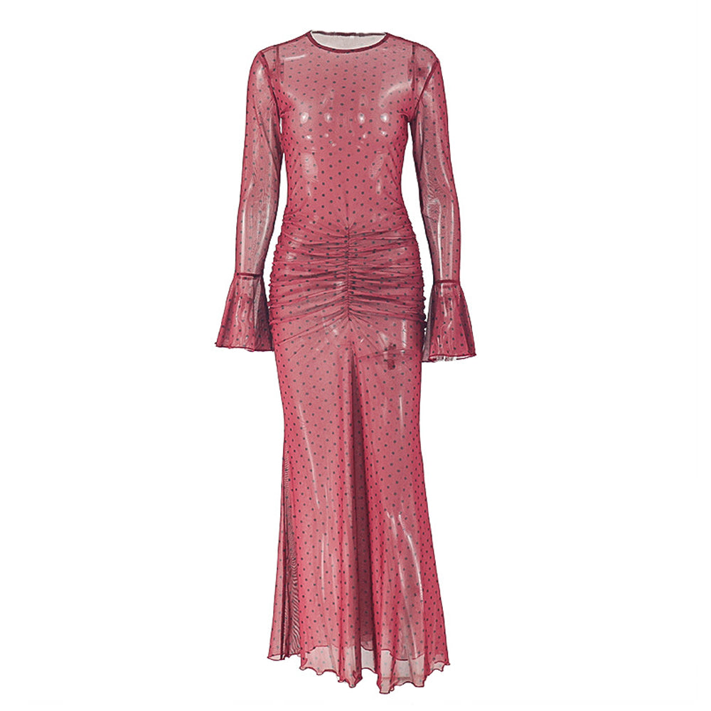 Polka dot long flared sleeve ruched sheer mesh maxi dress