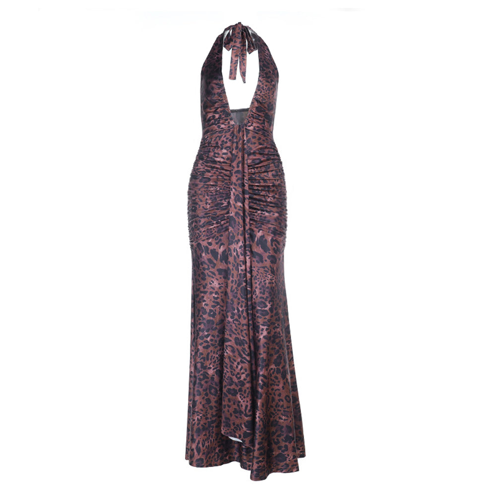 Leopard print ruched halter self tie v neck maxi dress
