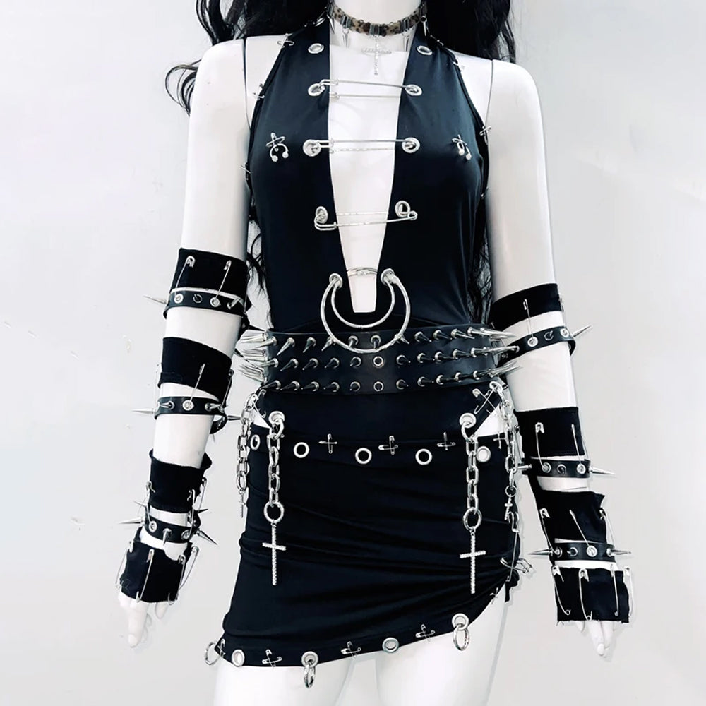 Hollow out o ring metal chain irregular mini skirt set