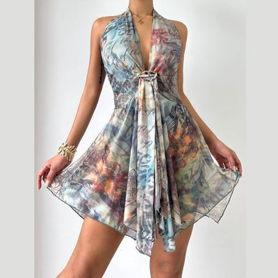 Halter v neck backless lace self tie hollow out cut out mini dress