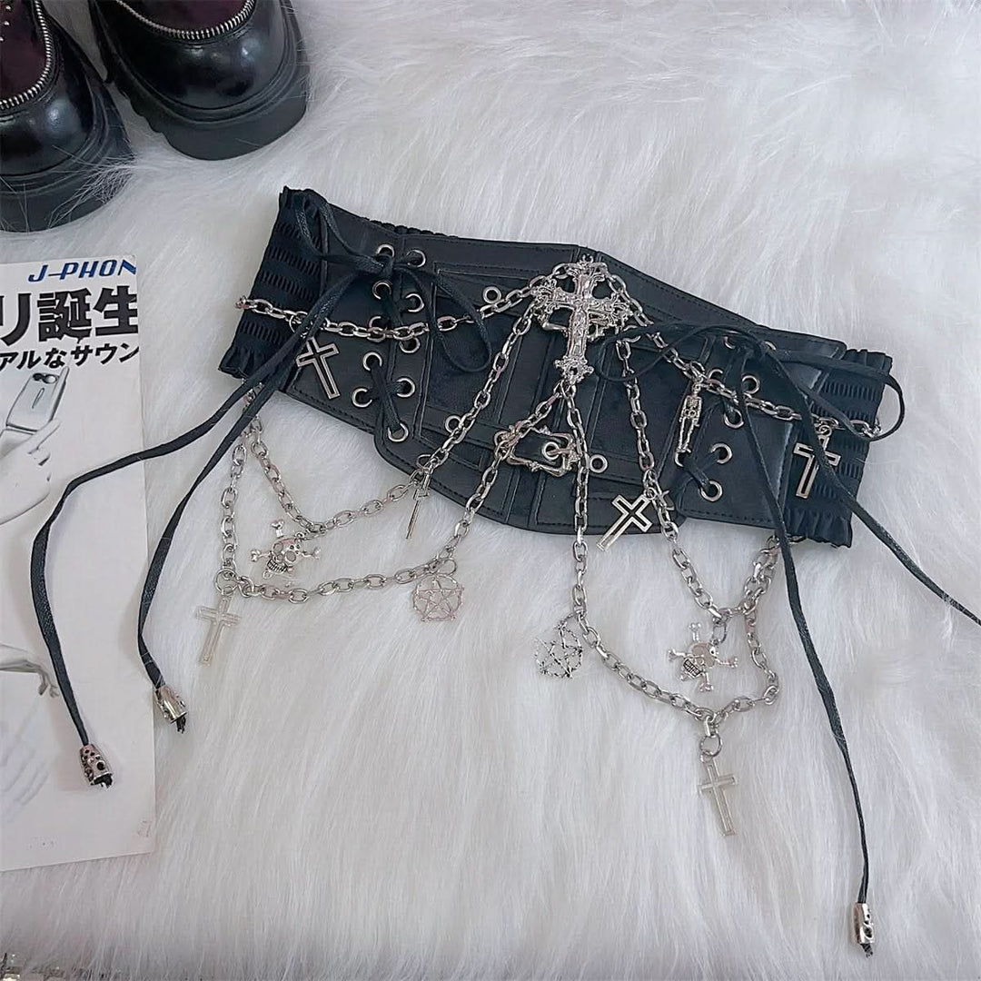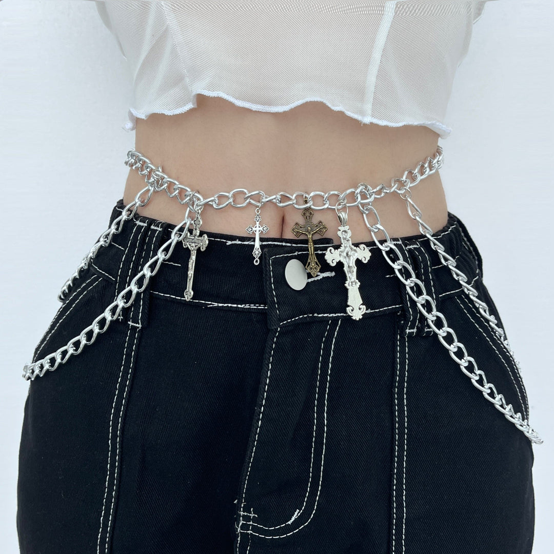 PU leather metal chain cross applique waist chain | Festival Outfits Women