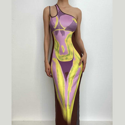 Body print sleeveless contrast backless u neck midi dress-final-sale