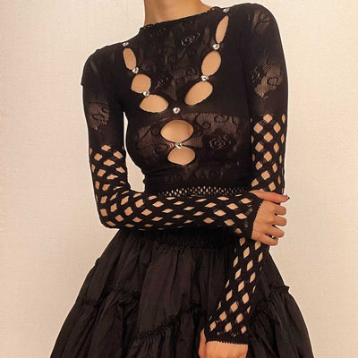 Off shoulder gloves long sleeve lace fishnet button see through romper