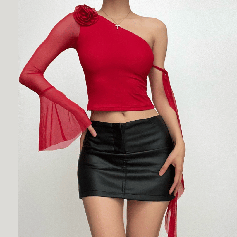 Long flared sleeve one shoulder mesh flower applique backless top-final-sale | Festival Outfits Women