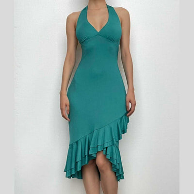Ruffle solid flower applique halter backless irregular midi dress-final-sale