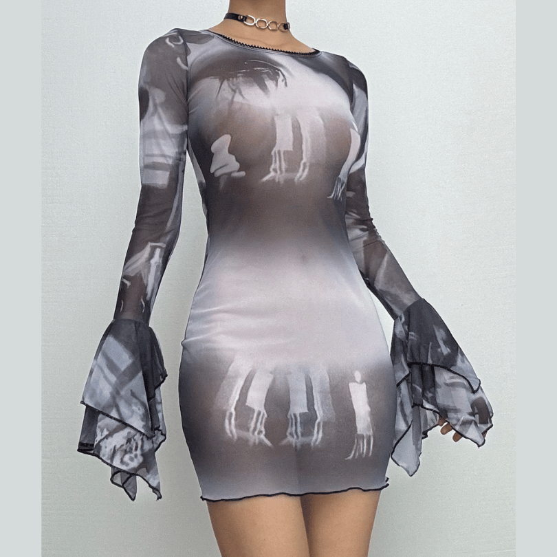 Long flared sleeve sheer mesh print ruffle mini dress-final-sale | Festival Outfits Women