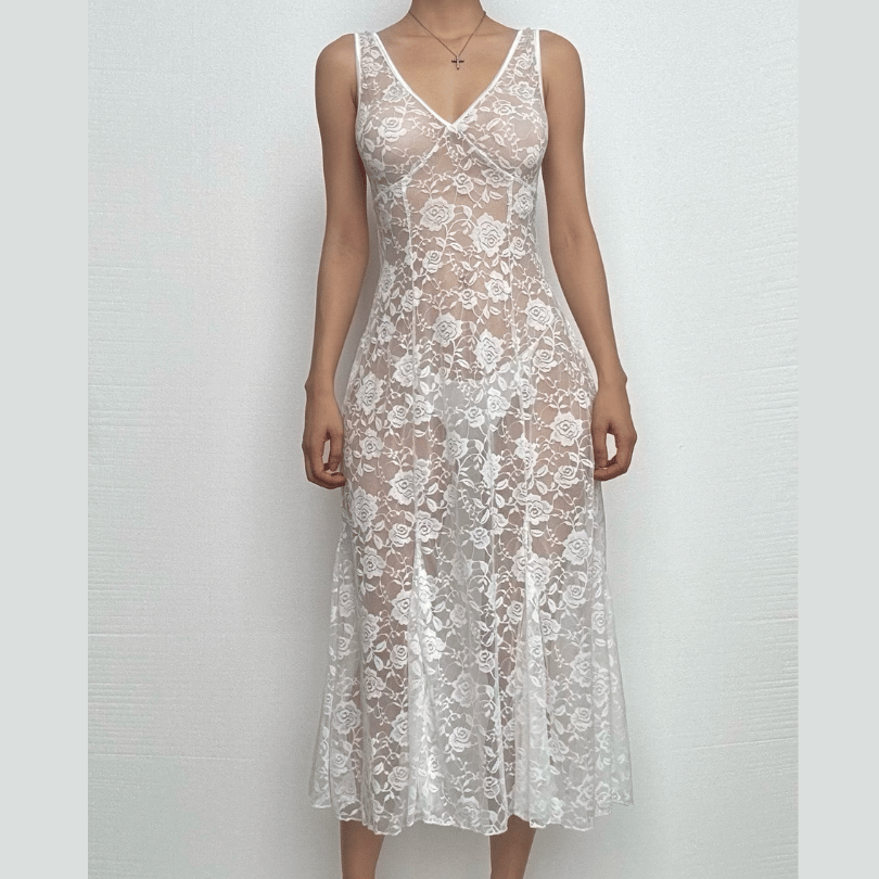 Sleeveless V neck rose pattern lace see through midi dress-final-sale | Festival Outfits Women