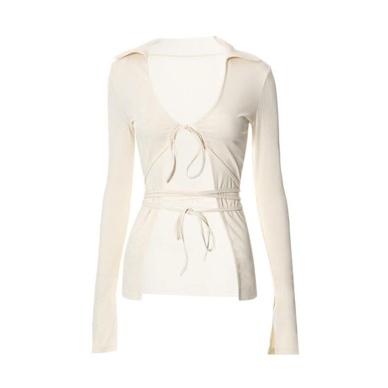 Turnover collar solid long sleeve self tie v neck crop top-final-sale | Festival Outfits Women