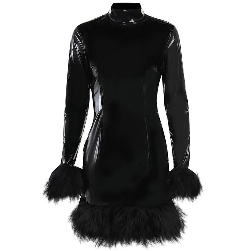 Long sleeve PU leather feather high neck zip-up mini dress-final-sale | Festival Outfits Women