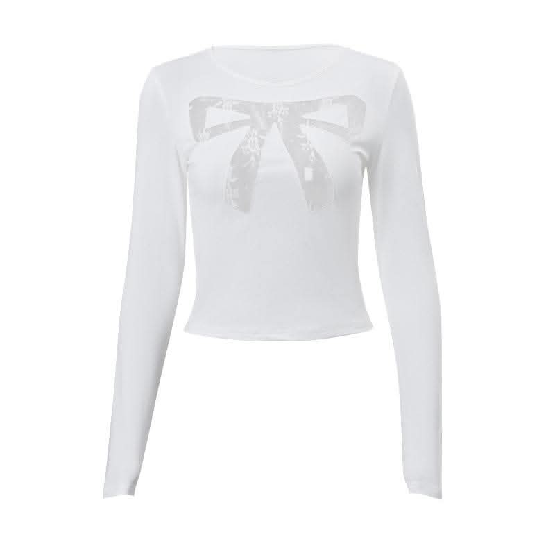 Long sleeve bowknot pattern lace mesh patchwork crewneck top-final-sale | Festival Outfits Women