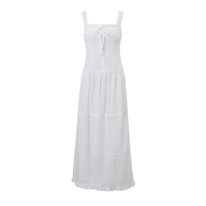 Ruched button square neck sleeveless smocked ruffle midi dress-final-sale | Festival Outfits Women
