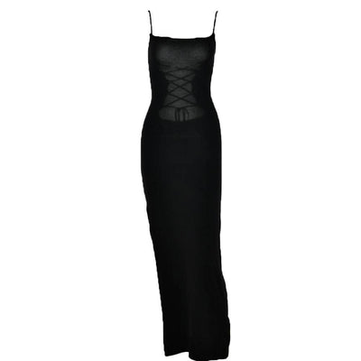 Lace up square neck slit solid backless cami maxi dress-final-sale