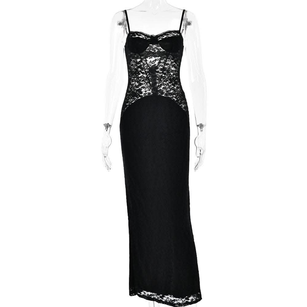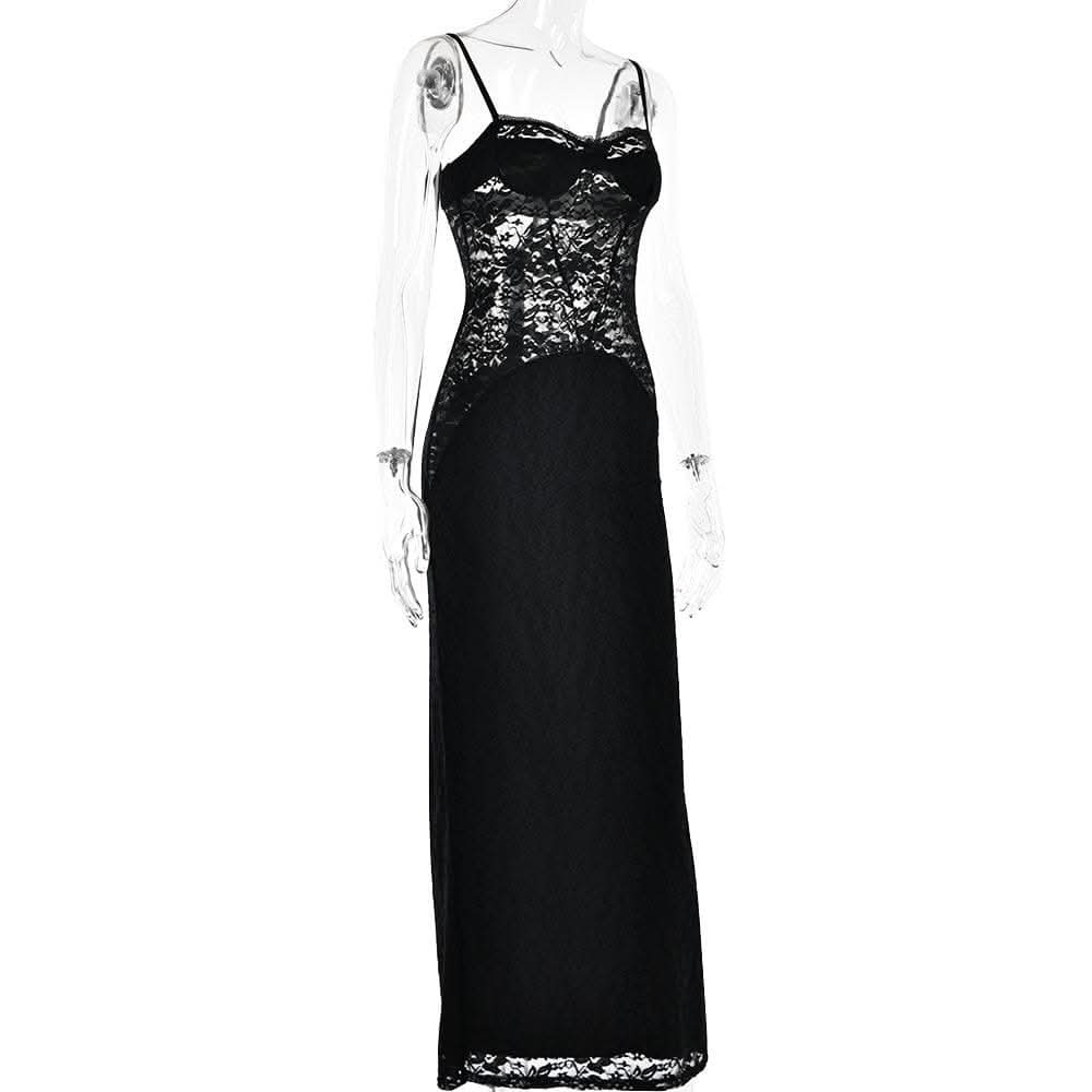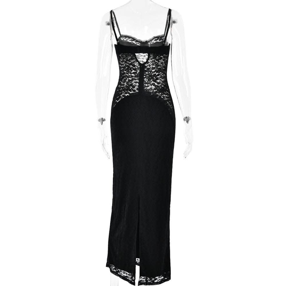 Button slit zip-up solid lace low cut maxi dress-final-sale
