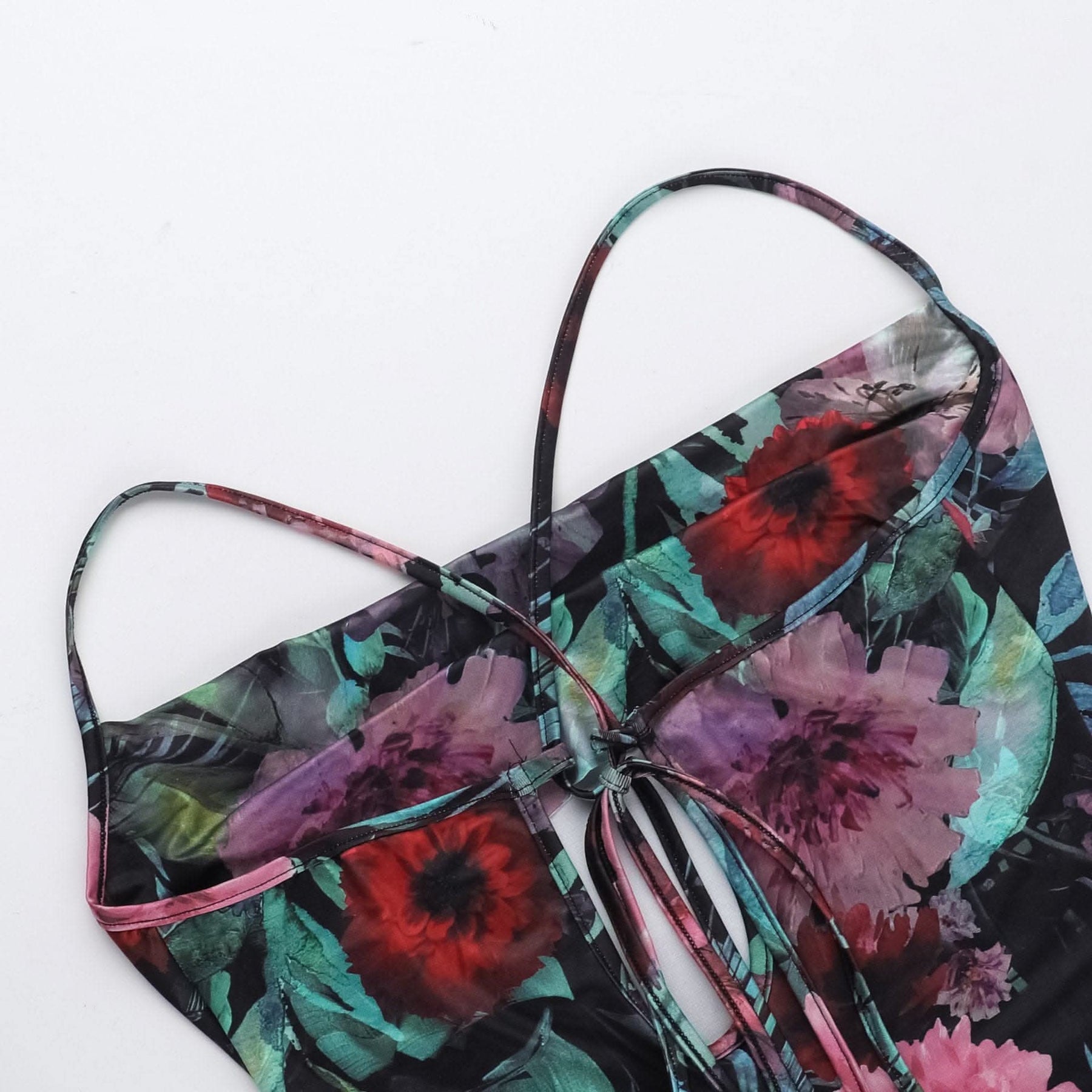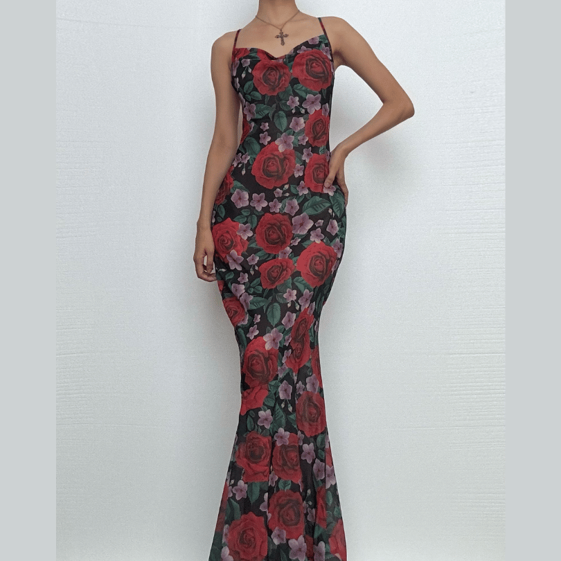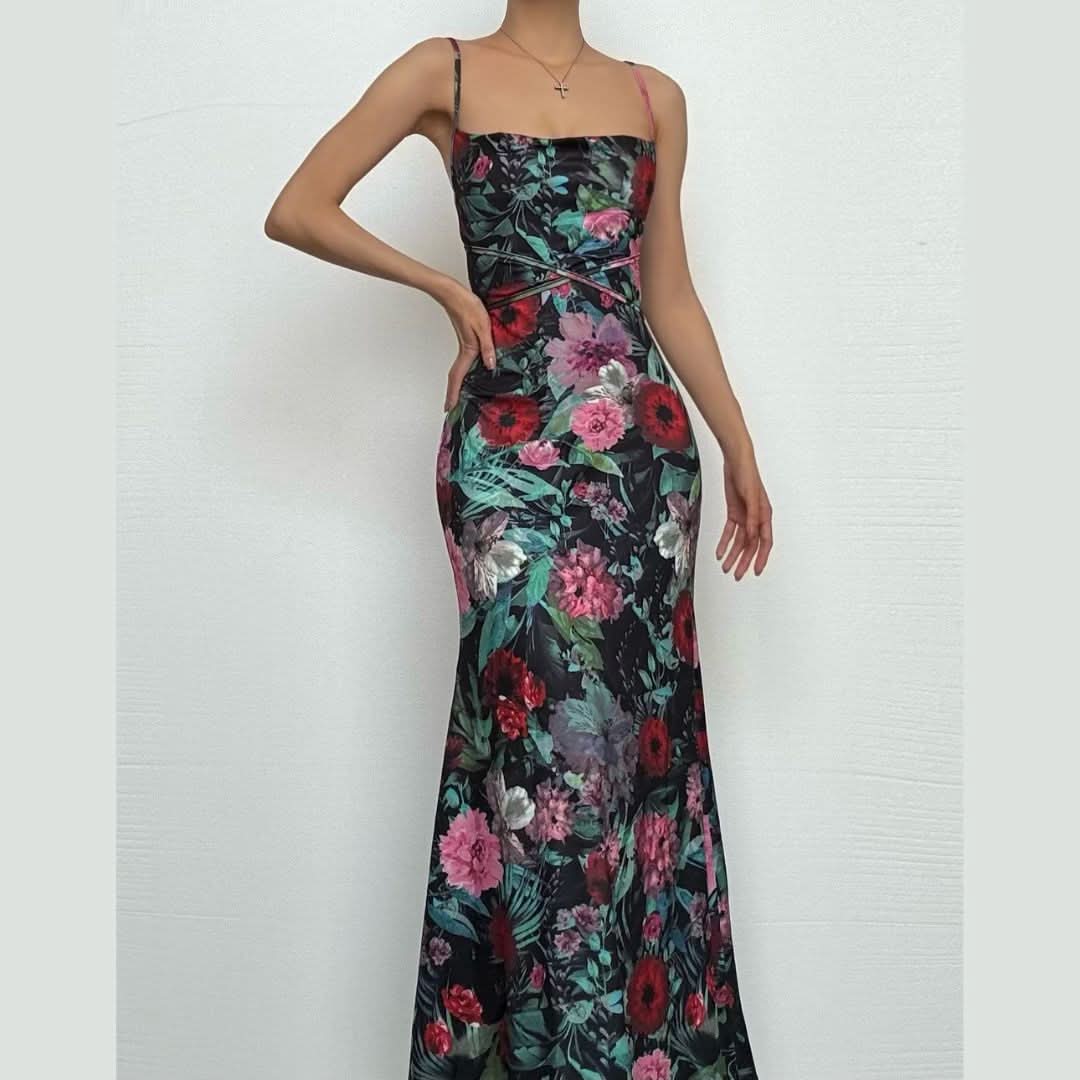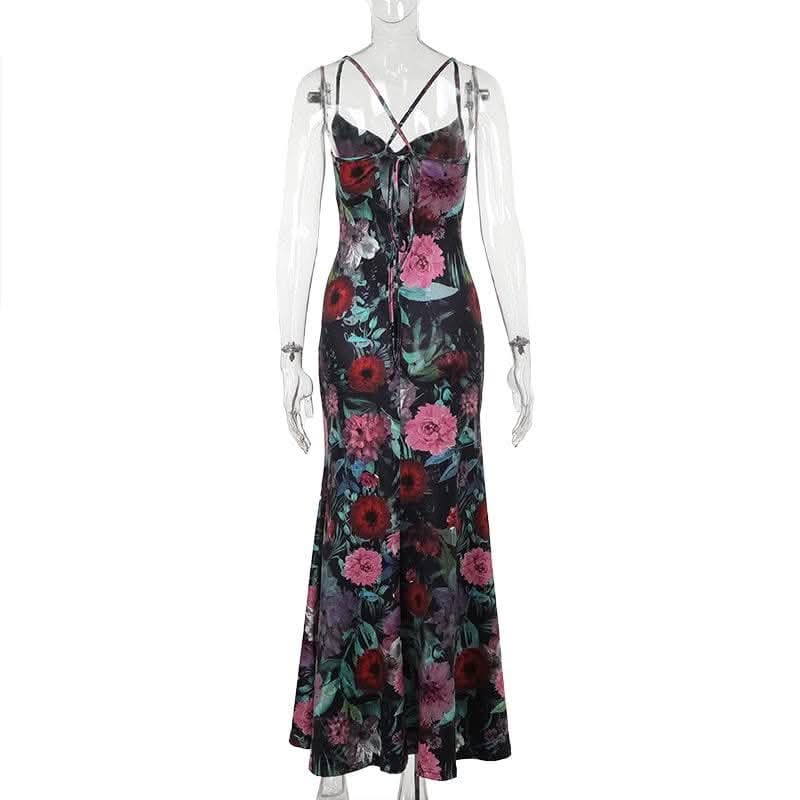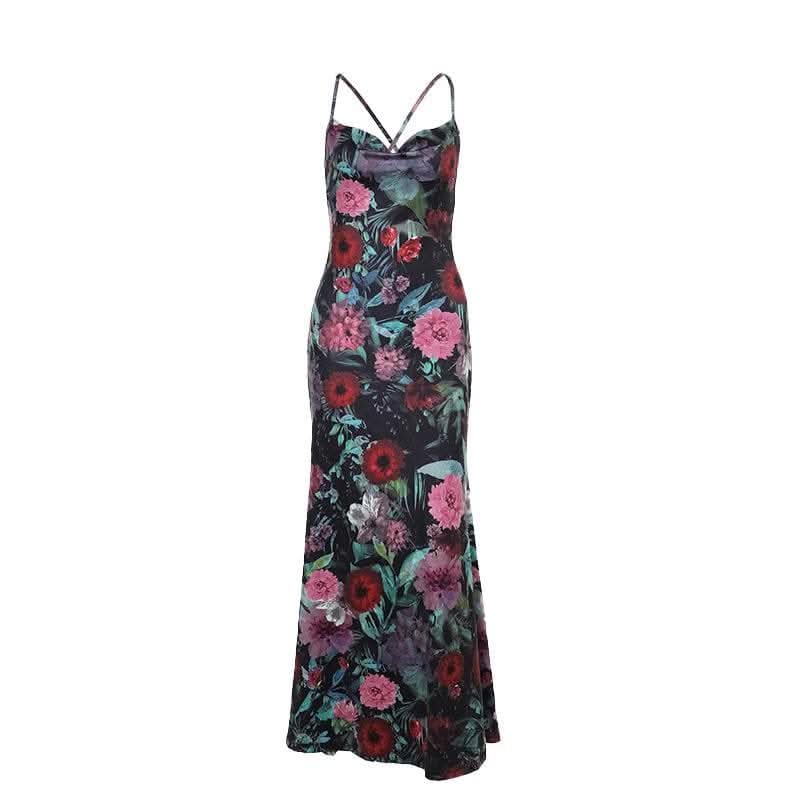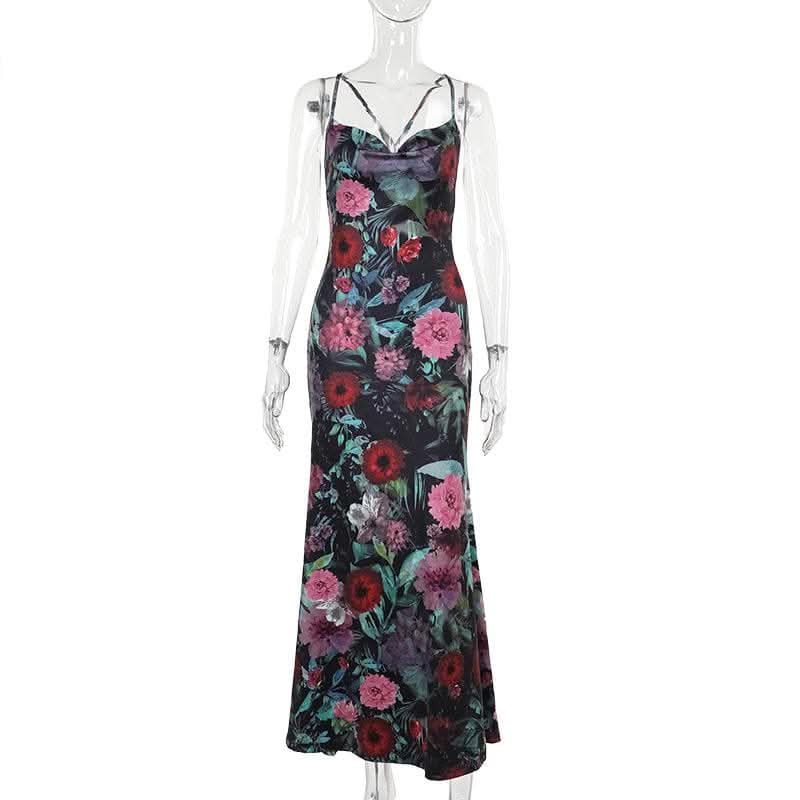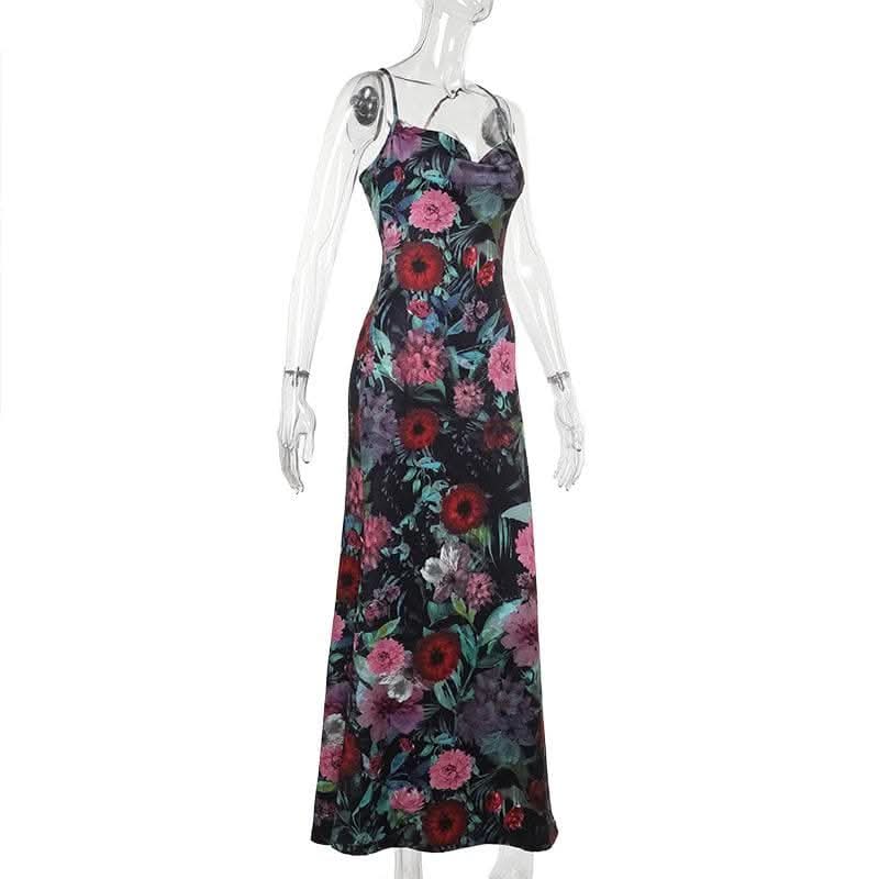 Cowl neck flower print contrast backless cami maxi dress-final-sale