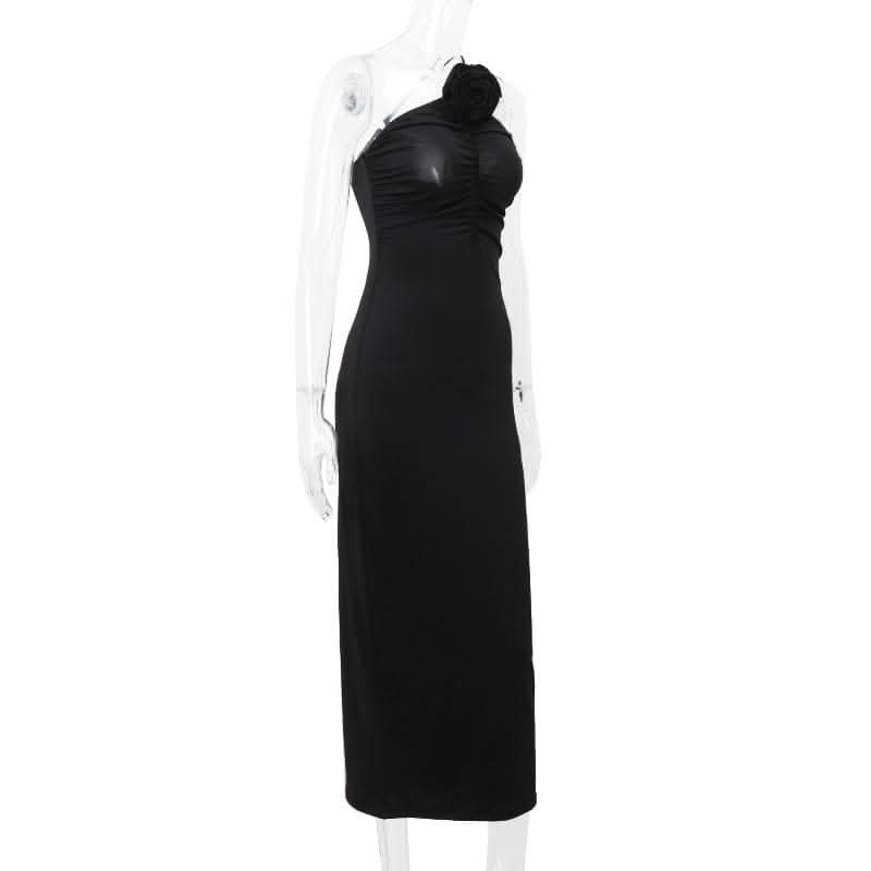 Flower applique one shoulder solid ruched maxi dress-final-sale