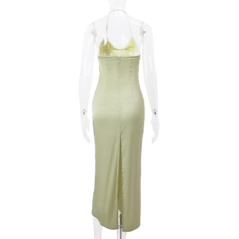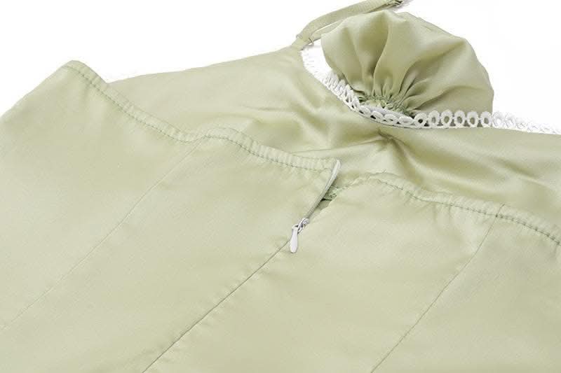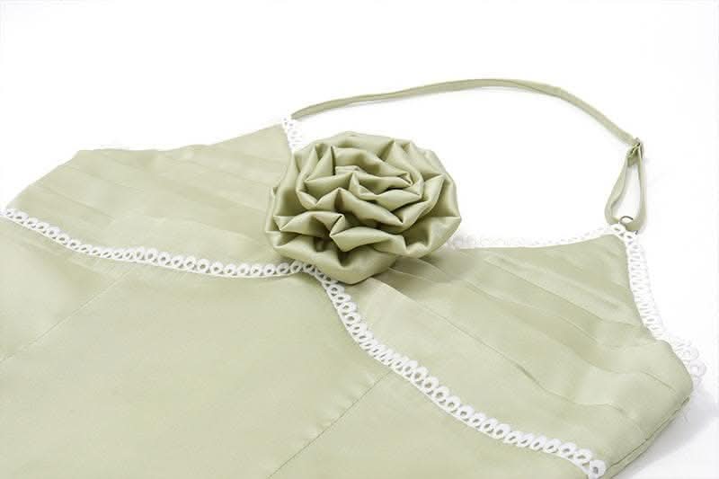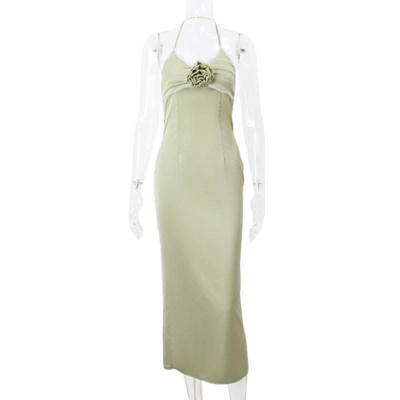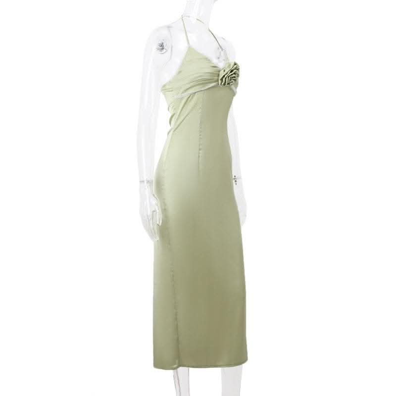 Flower applique zip-up halter ruched slit solid midi dress-final-sale
