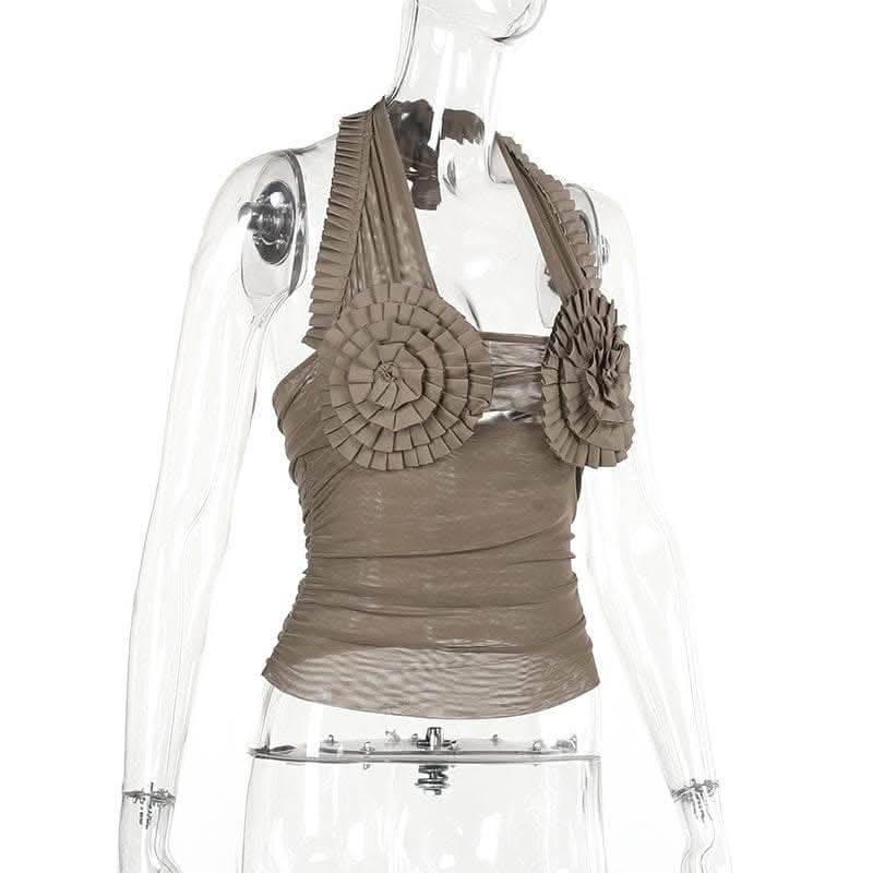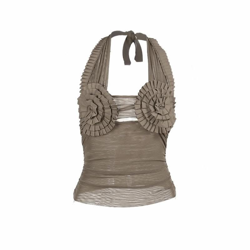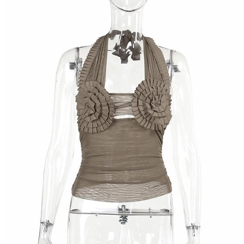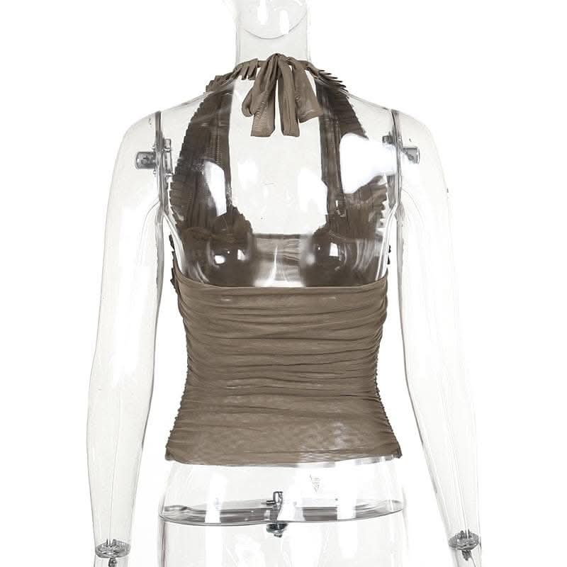 Halter pleated hollow out ruched mesh backless cut out top-final-sale