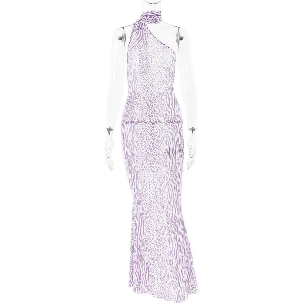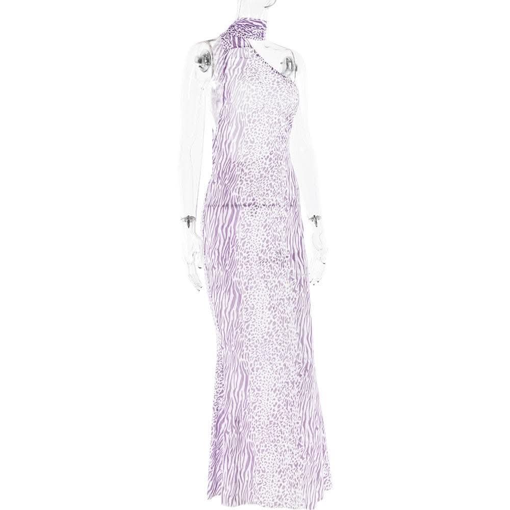 Halter one shoulder leopard print sheer mesh maxi dress-final-sale