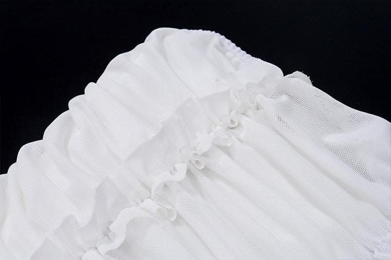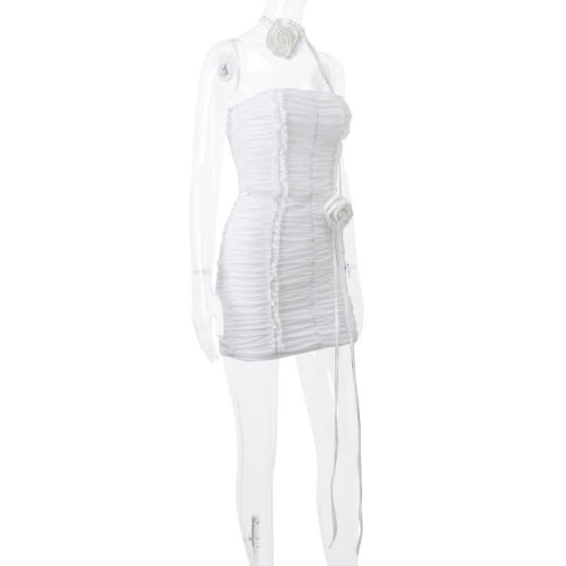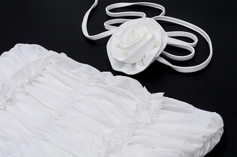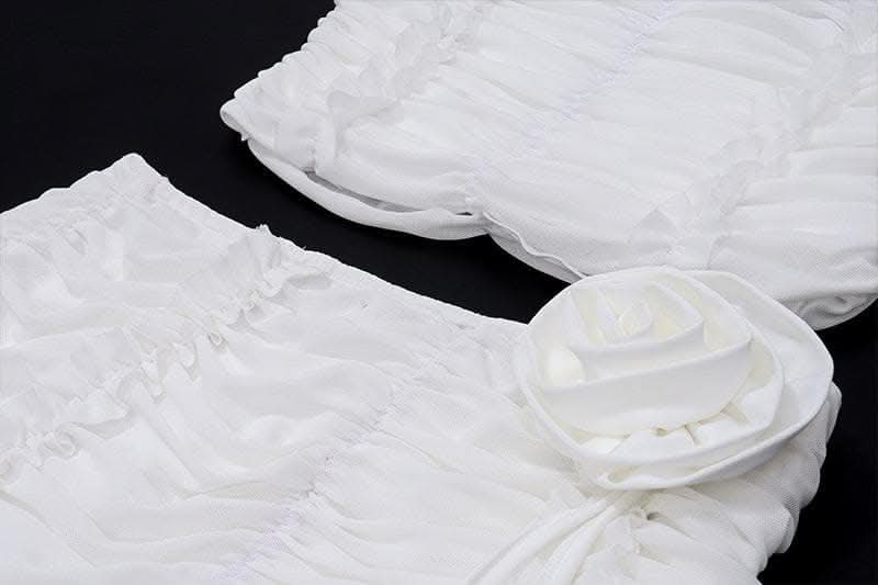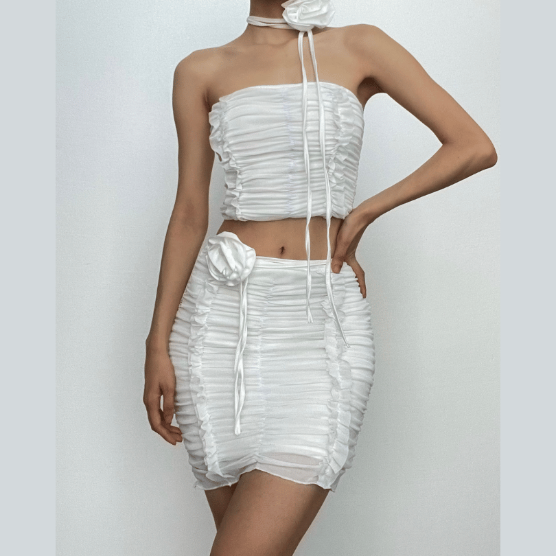 Ruffle flower applique ruched solid tube mini skirt set-final-sale