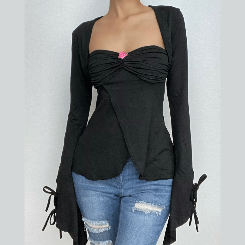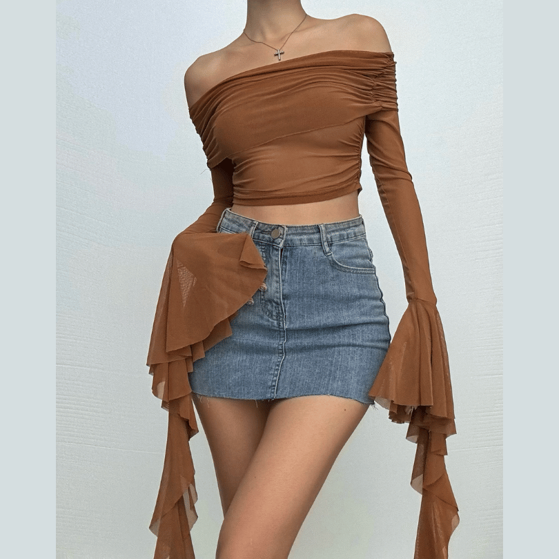 Long flared sleeve off shoulder ruffle sheer mesh backless top-final-sale | Festival Outfits Women