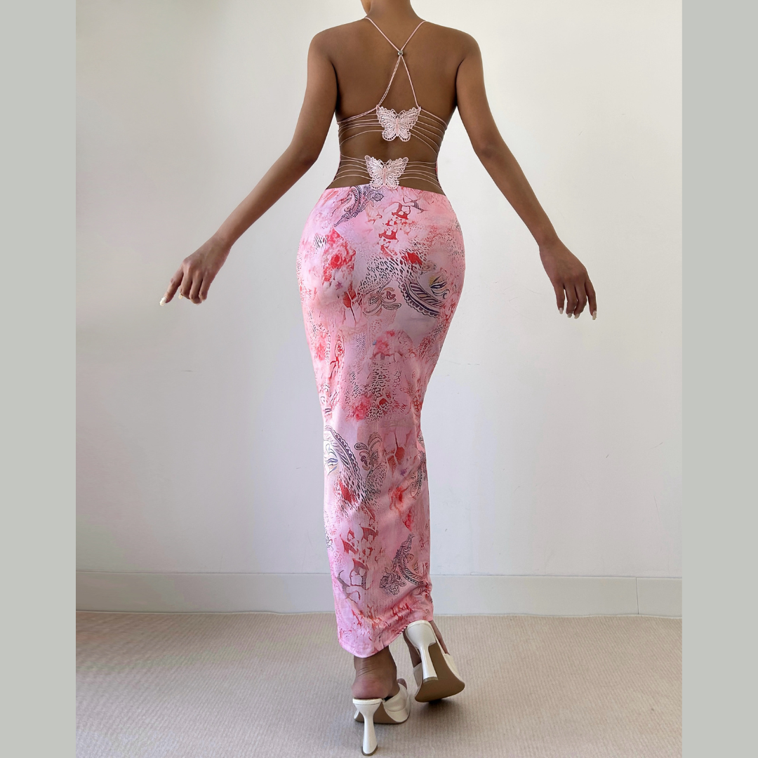 Butterfly applique backless v neck maxi dress