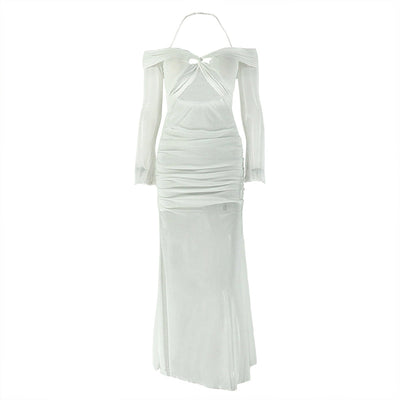 Long sleeve off shoulder halter hollow out mesh maxi dress
