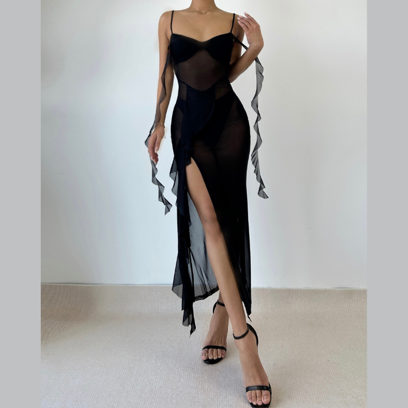 Sweetheart neck ruffle high slit sheer mesh cami midi dress | Festival Outfits Women-final-sale