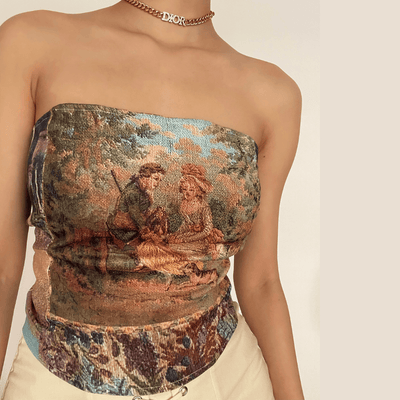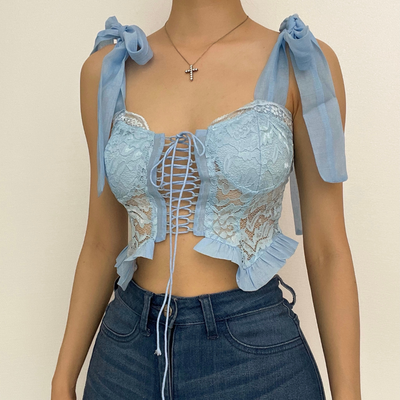 Butterfly embroidery drawstring mesh lace up bustier crop top