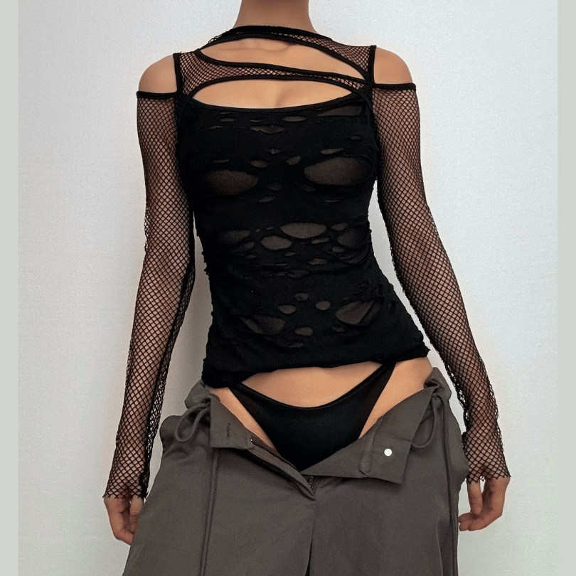 Long sleeve fishnet hollow out irregular see through cut out top | Festival Outfits Women