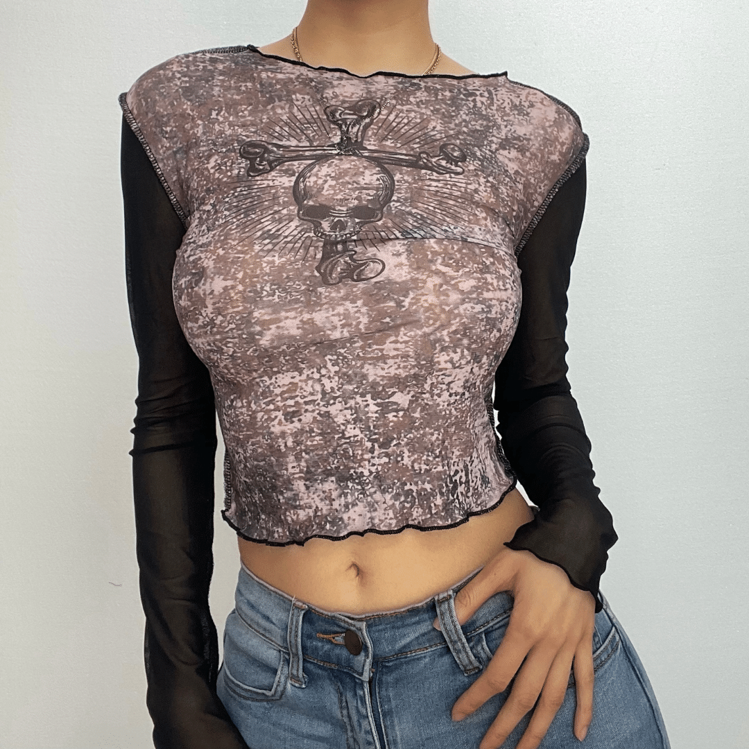 Long sleeve stitch abstract print mesh see through crop top | Mesh Long Sleeve Crop Top
