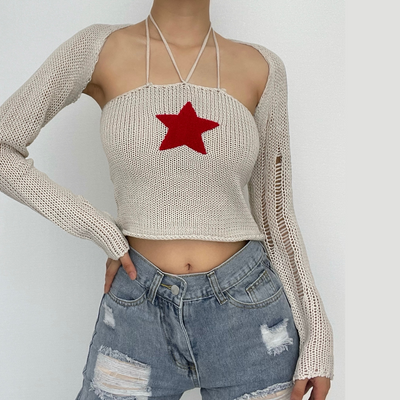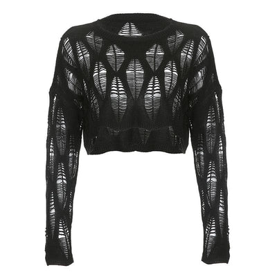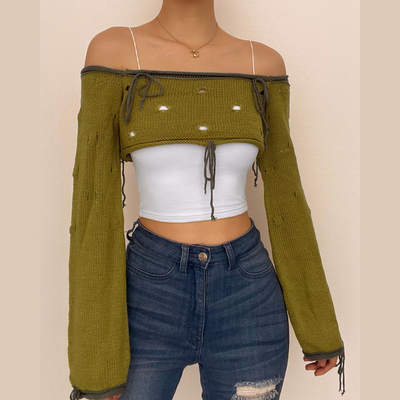 Long sleeve knitted hollow out ribbed cross front crop cut out top