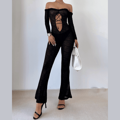 Off shoulder long sleeve hollow out lace hem jumpsuit