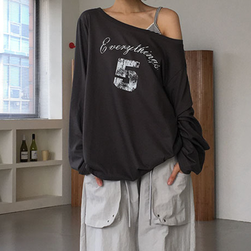 Long sleeve letter pattern one shoulder top
