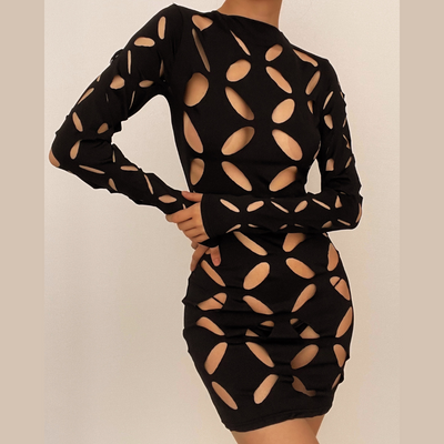 Hollow out irregular long sleeve crewneck cut out mini dress