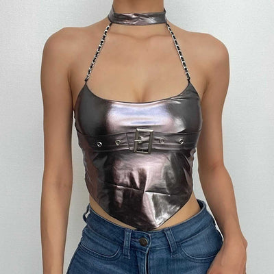 Halter PU leather o ring rivet applique metal chain top