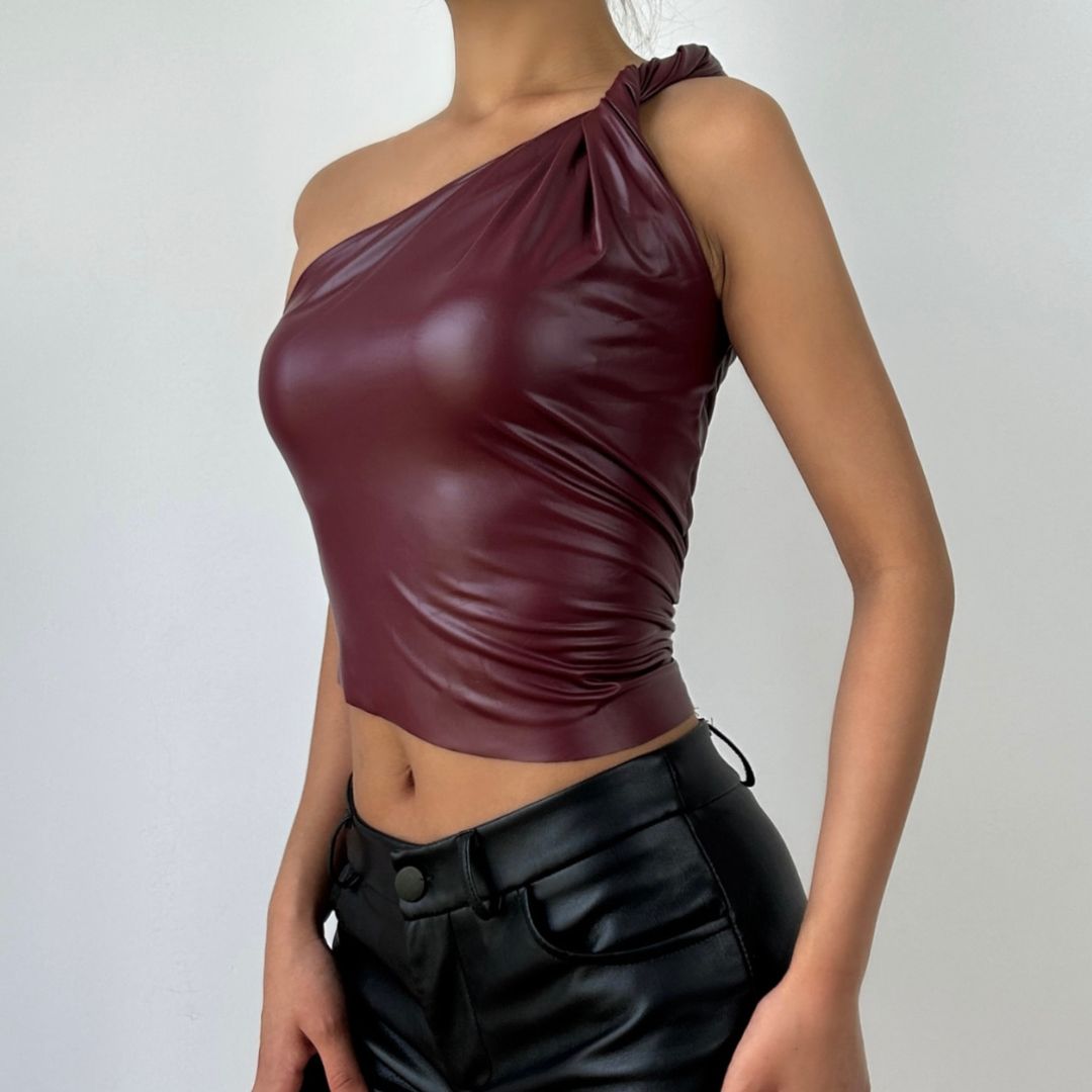 One shoulder PU leather ruched backless top