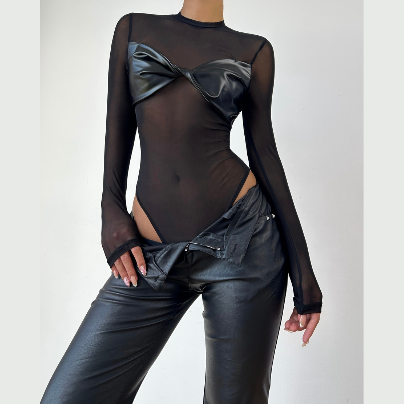 Crewneck long sleeve mesh PU leather bodysuit | Festival Outfits Women-final-sale