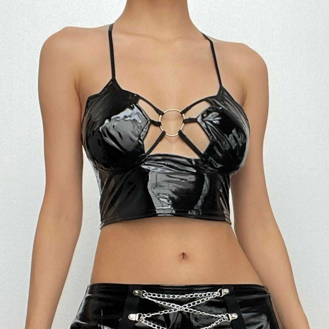 Halter hollow out PU leather o ring backless solid crop top-final-sale